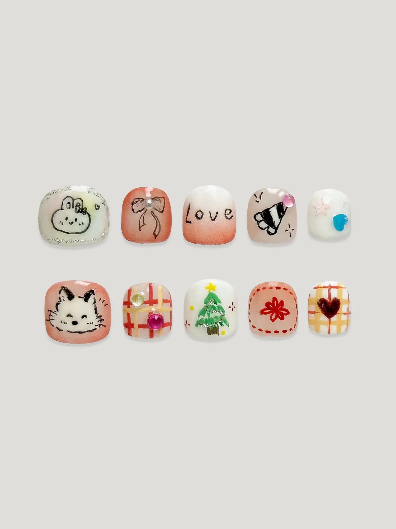 - Ten unique designs feature hand-drawn minimalist patterns including bunnies, cats, bows, hearts, a Christmas tree, and the word “Love”.